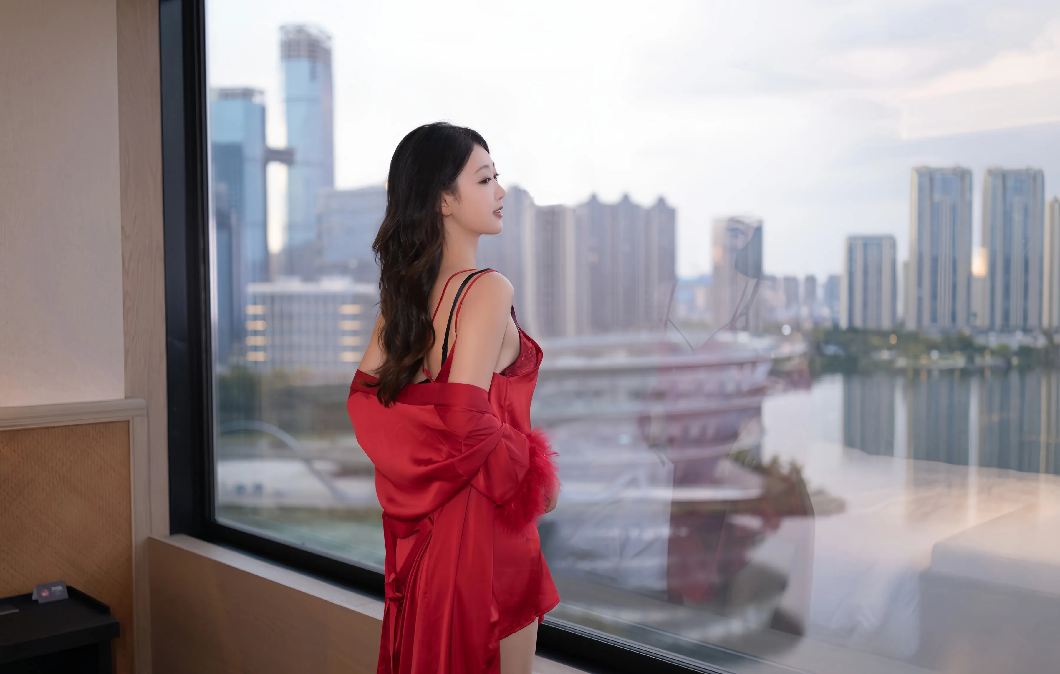 红色睡衣的热烈与肉色丝袜的性感相互映衬,构成了一幅幅令人心动的画面。