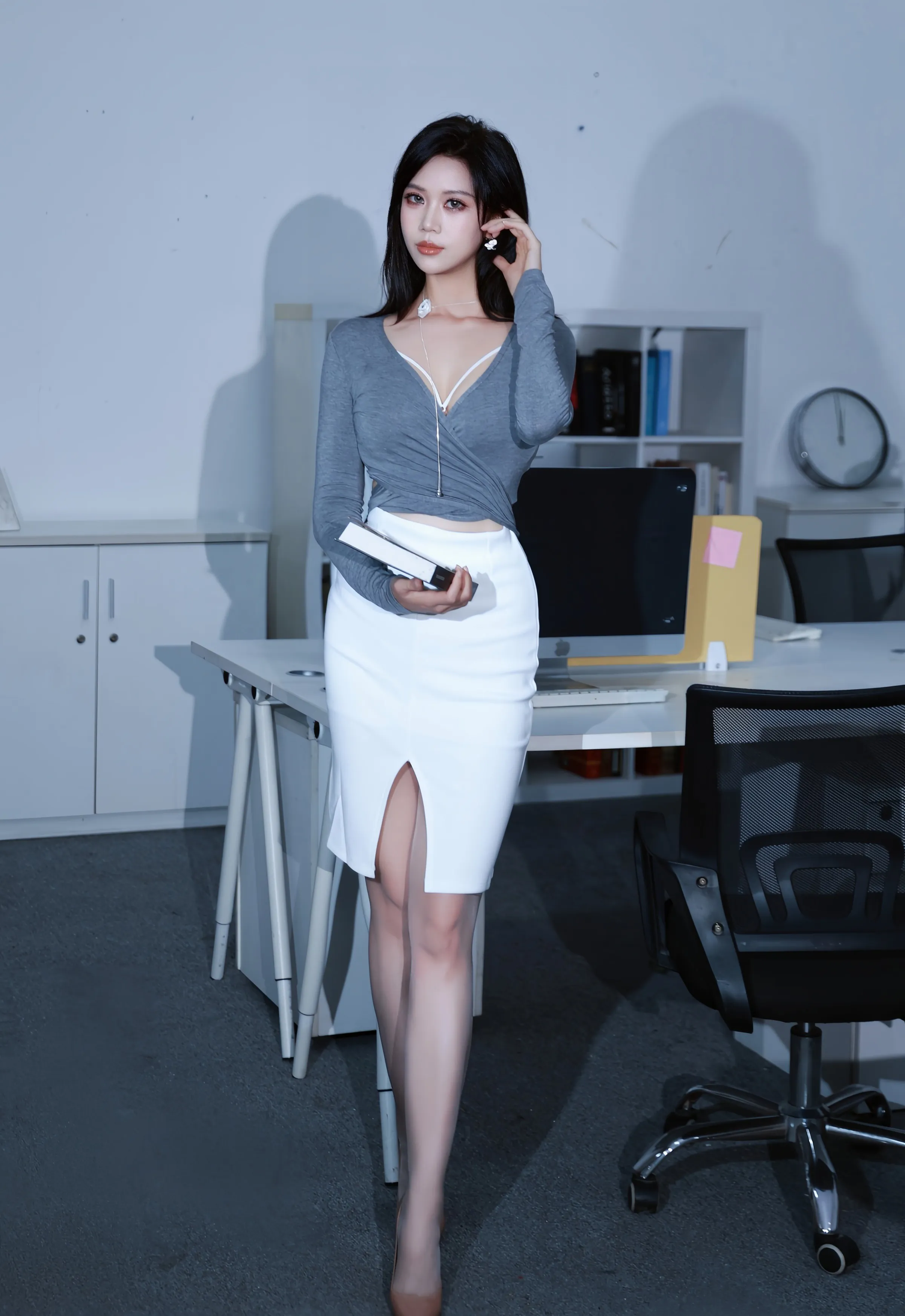 写真中,她身着性感白色包臀裙,将身材曲线完美勾勒,凹凸有致,尽显迷人魅力。搭配上性感灰色丝袜,更是增添了几分诱惑与风情。