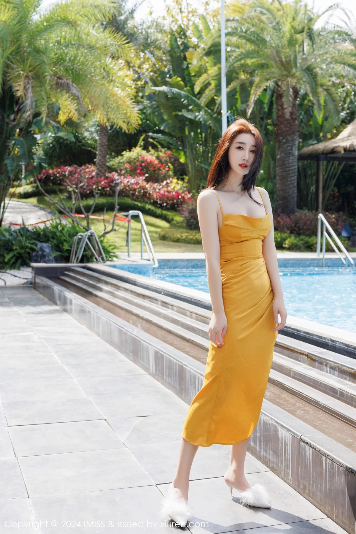 她身着性感黄色吊带长裙,那鲜艳的黄色仿佛能点燃整个画面,将她的魅力展现得淋漓尽致。裙子的设计巧妙地勾勒出她曼妙的身姿,每一处线条都恰到好处,散发着迷人的气息。